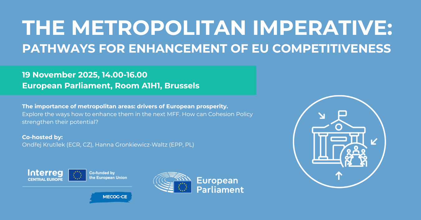 Thanks to the MECOG-CE project, we are organizing a seminar at the European Parliament entitled “The Metropolitan Imperative: Pathways for Enhancing EU Competitiveness.” The event will take place on 19 November from 2 to 4 p.m. and will focus on the strategic role of metropolitan areas in Europe.