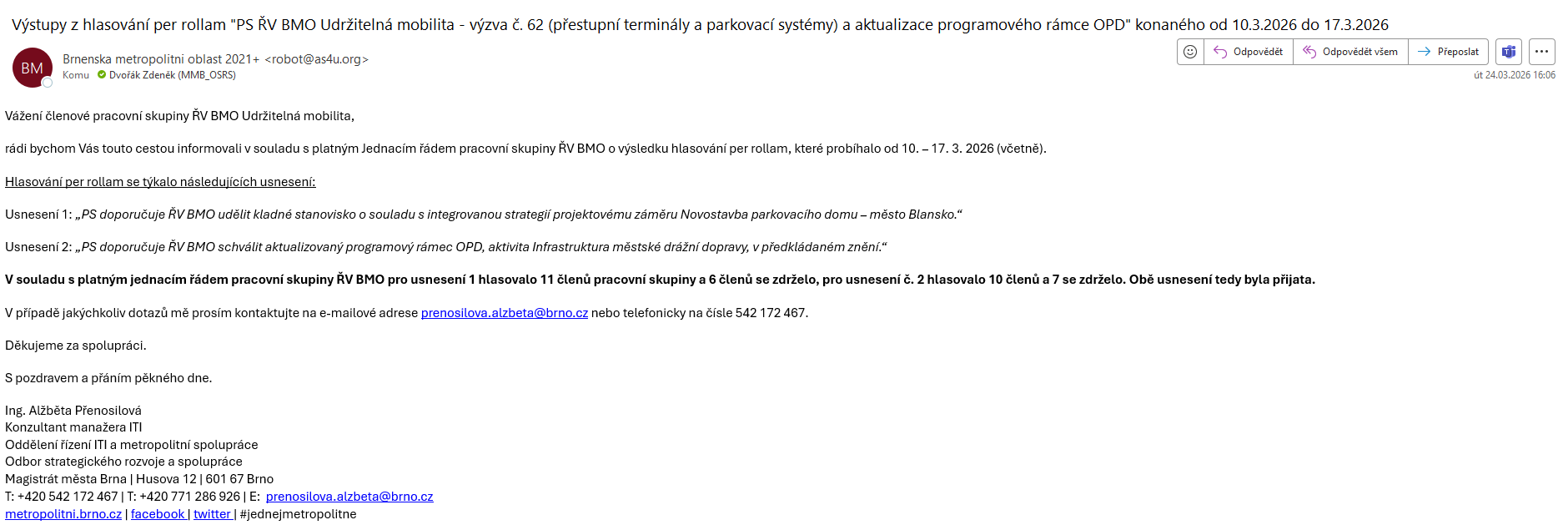 | Zástupce SUMP Brna | vedoucí oddělení | Iva Rorečková |